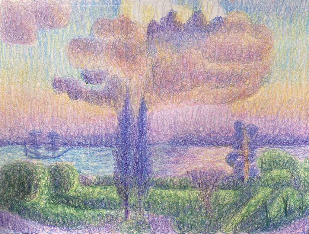 Using a simple and inherently fun medium, artists are led step by step to create their own beautiful fridge-worthy works of art! The kid-like feeling of crayons keeps us in a state of play. We are doodling, scribbling, swirling, and layering color. I have labeled these works of impressionist art ranging from easier to more challenging, but any of them can be enjoyed by all experience levels. Tween to adult groups. I curate the crayon selections for each program using ALL the fun colors!